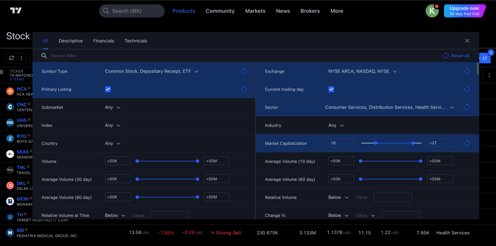I use this tool called https://www.tradingview.com/screener/. I havent used the paid version yet so I dont have an idea of what extra features the paid version contains but the free version has been pretty useful to me.