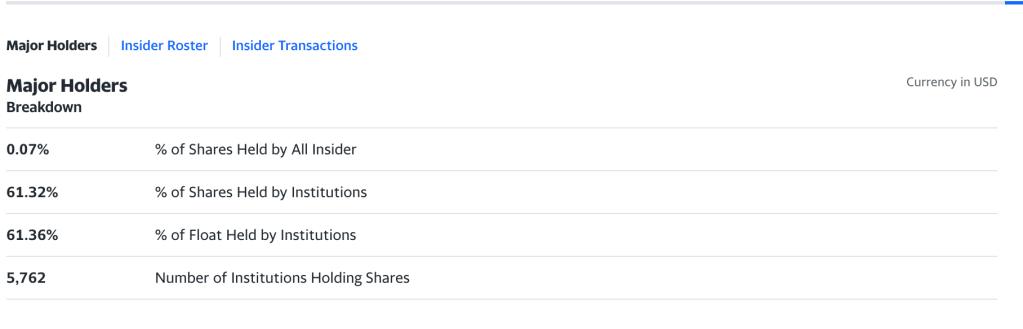 Here we can get a snapshot of net Insider transactions as well as the percentage of all shares held by insiders –